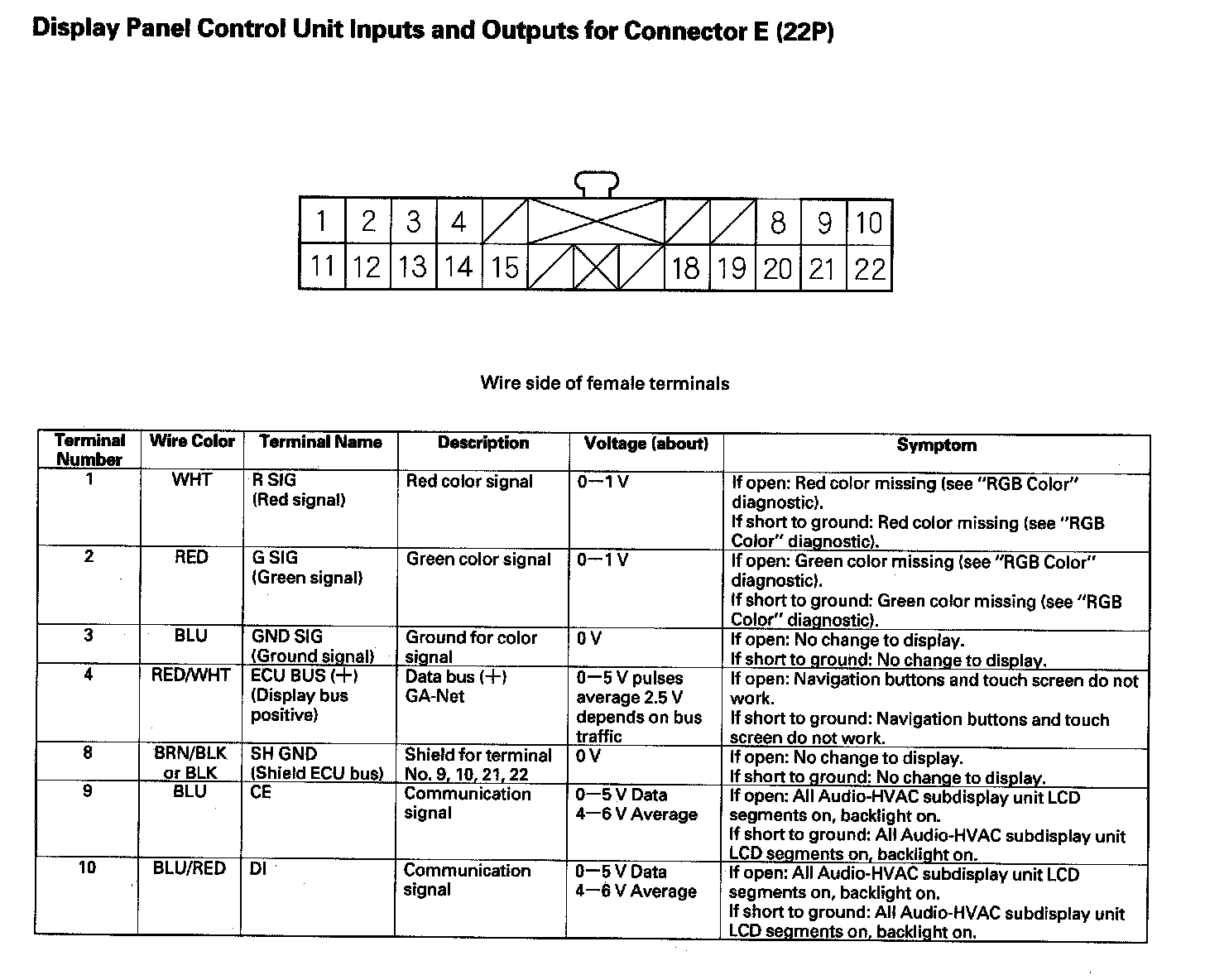 Display Panel Control Unit Inputs And Outputs For Connector E (22P) Part 1: