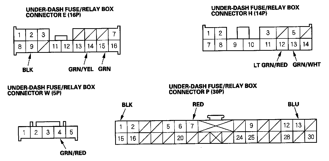 6. Reconnect the connectors to the under-dash fuse/relay box. Turn the ignition switch ON (II), and make these input tests at the appropriate connectors on the under-dash fuse/relay box.