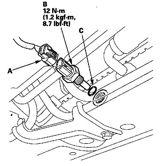 5. Install the parts in the reverse order of removal with a new O-ring (C), then refill the radiator with engine coolant.