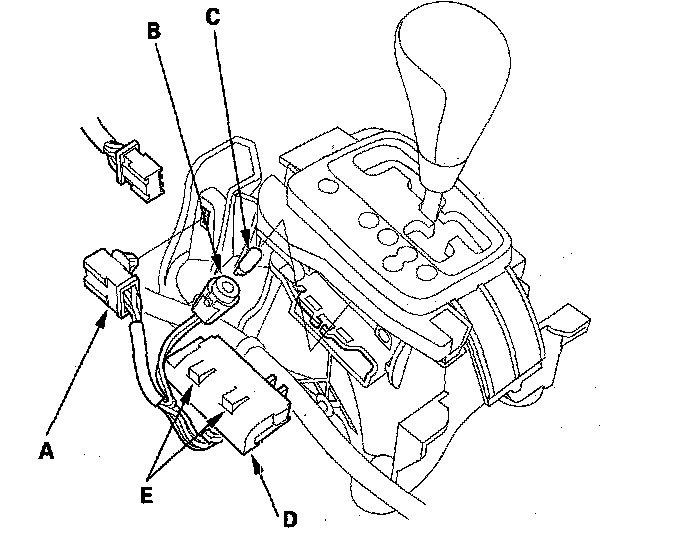 4. Remove the transmission gear selection switch/park pin switch (D) by releasing the lock tabs (E).
