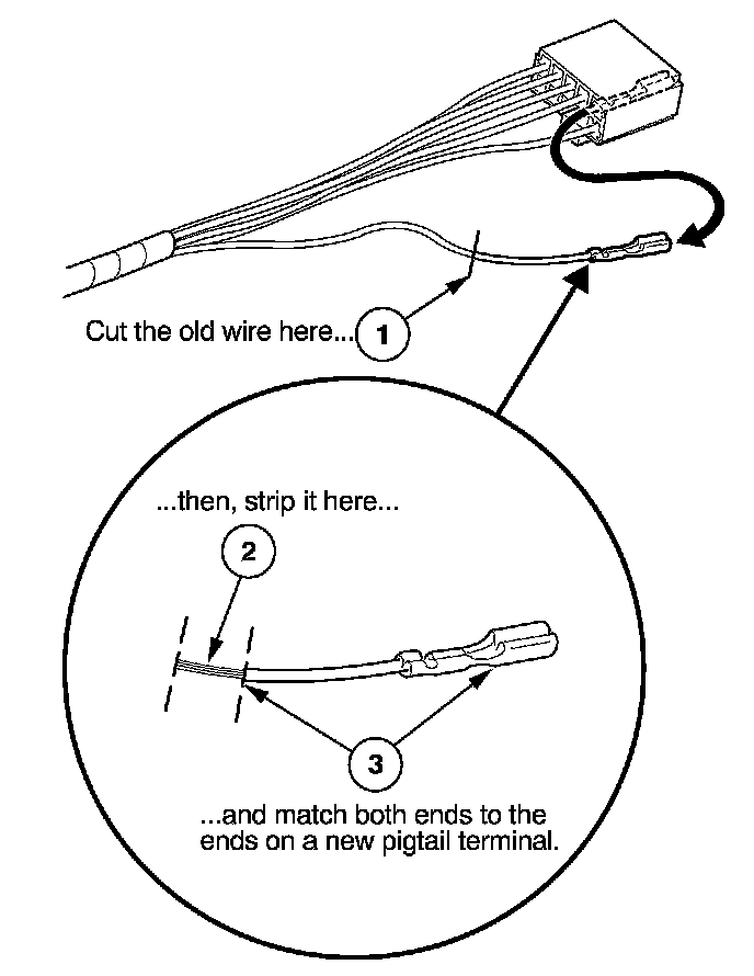2. Cut off the wire about an inch back from where it connects to the damaged or faulty terminal, then strip about half of the insulation off that piece. This will be used to size the wire end of the replacement pigtail terminal.
