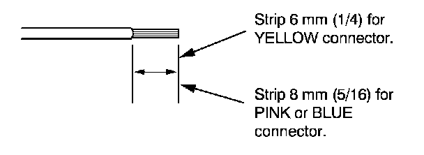 7. If you are using a yellow splice connector, strip about 6 mm (1/4 inch) of insulation off the ends of both wires. If you are using a pink or blue splice connector, strip off about 8 mm (5/16 inch) of insulation.