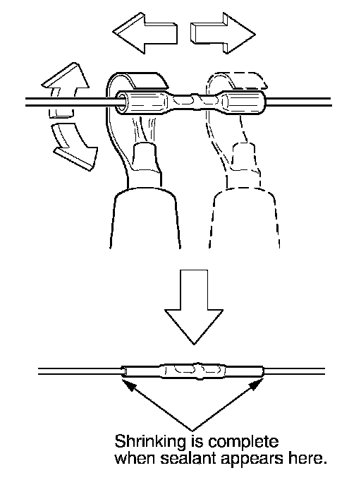 13. Plug in the heat gun, and turn it on. Start at the middle of the splice connector, and move the gun toward the ends as the tube shrinks. Apply heat evenly by rotating the curved heat spreader around the splice connector. Shrinking is complete when a small amount of sealant appears at each end of the tube.