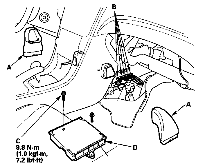 11. Remove the bolts (C), then remove the PCM (D).