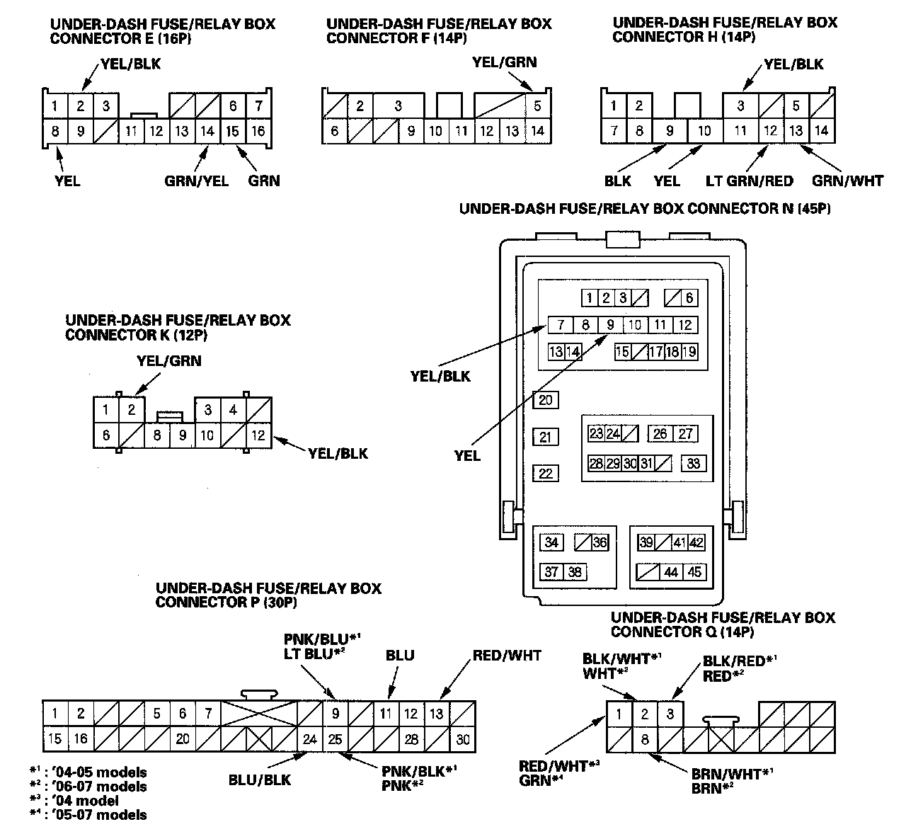 6. Reconnect all connectors to the under-dash fuse/relay box, turn the ignition switch ON (II), and make these input tests at the appropriate connectors on the under-dash fuse/relay box.