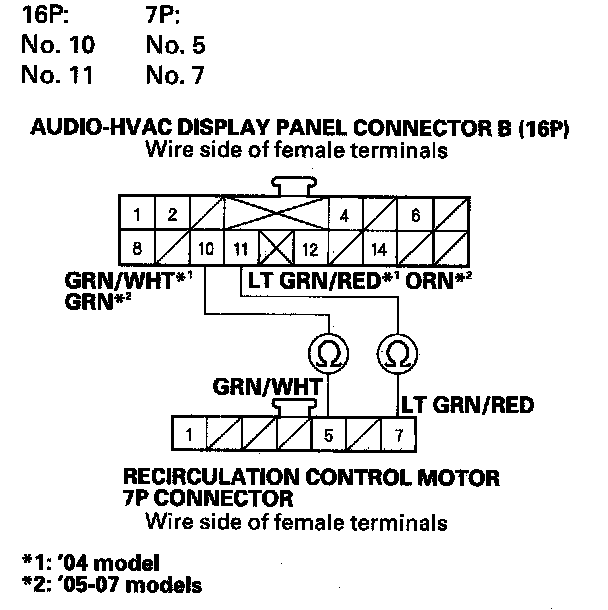 11. Check for continuity between the following terminals of audio-HVAC display panel connector B (16P) and the recirculation control motor 7P connector.