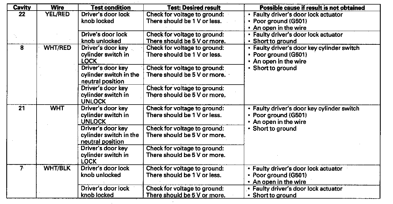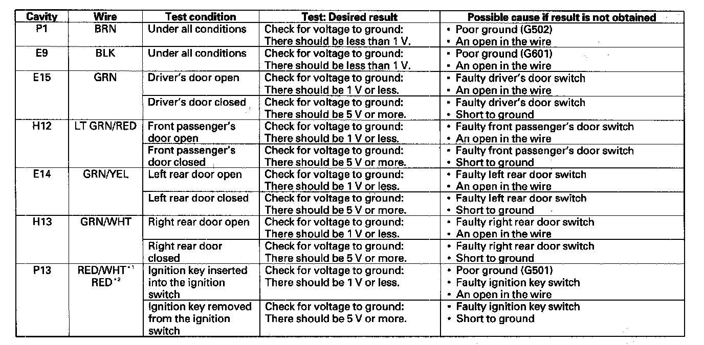 10. Reconnect the connector to the door multiplex control unit, turn the ignition switch ON (II), and make these input tests at the connector.