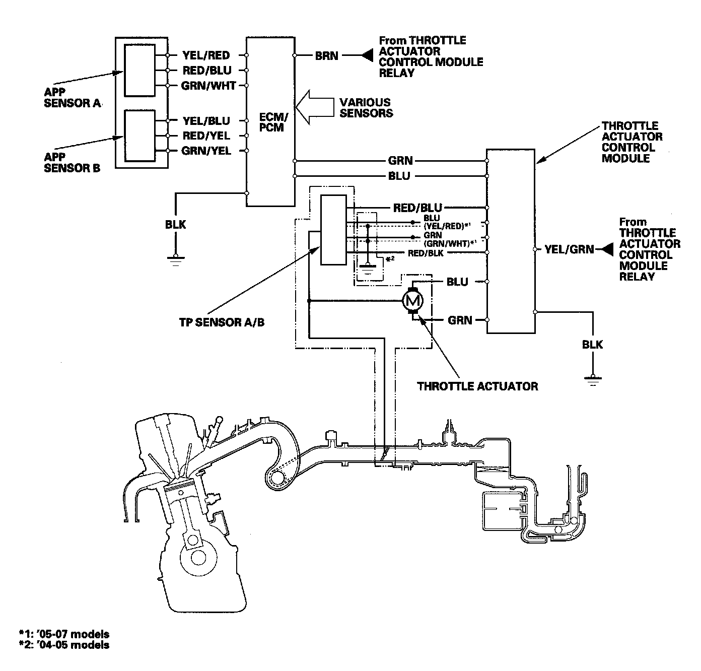The electronic throttle control system consists of the throttle actuator, the throttle position (TP) sensor A/B, the accelerator pedal position (APP) sensor A/B, the throttle actuator control module, and the ECM/PCM.The throttle is electronically controlled by this system.