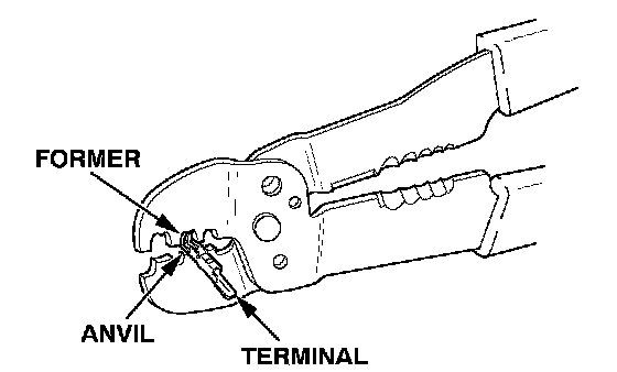 4. Position the terminal in the crimping tool slot with the solid portion of the terminal toward the anvil and the open section toward the former.