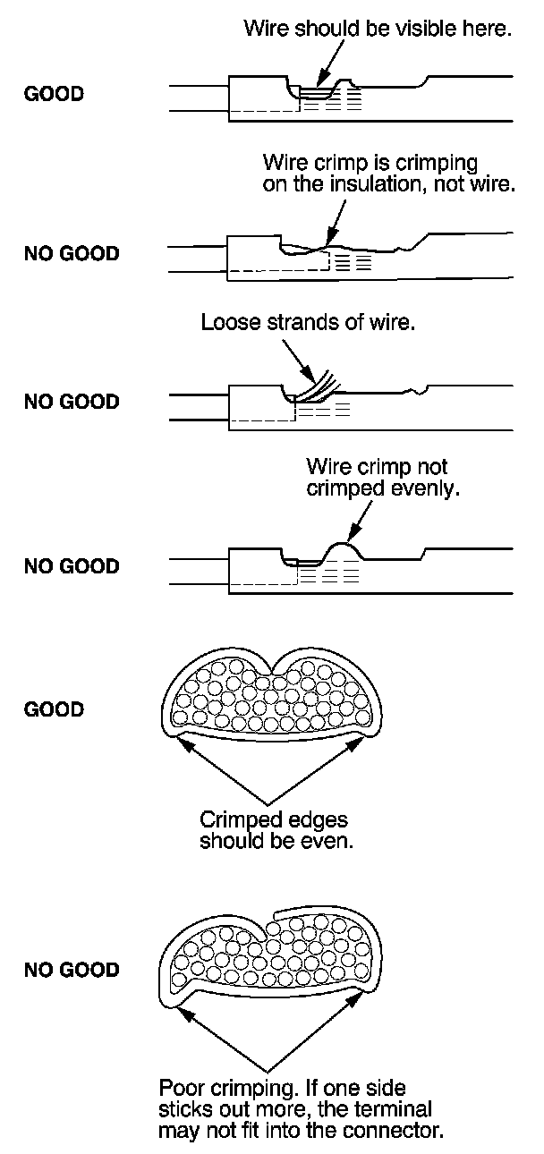8. Inspect the quality of the wire crimp. If it has any of the shown NO GOOD crimps, cut it off and start over.