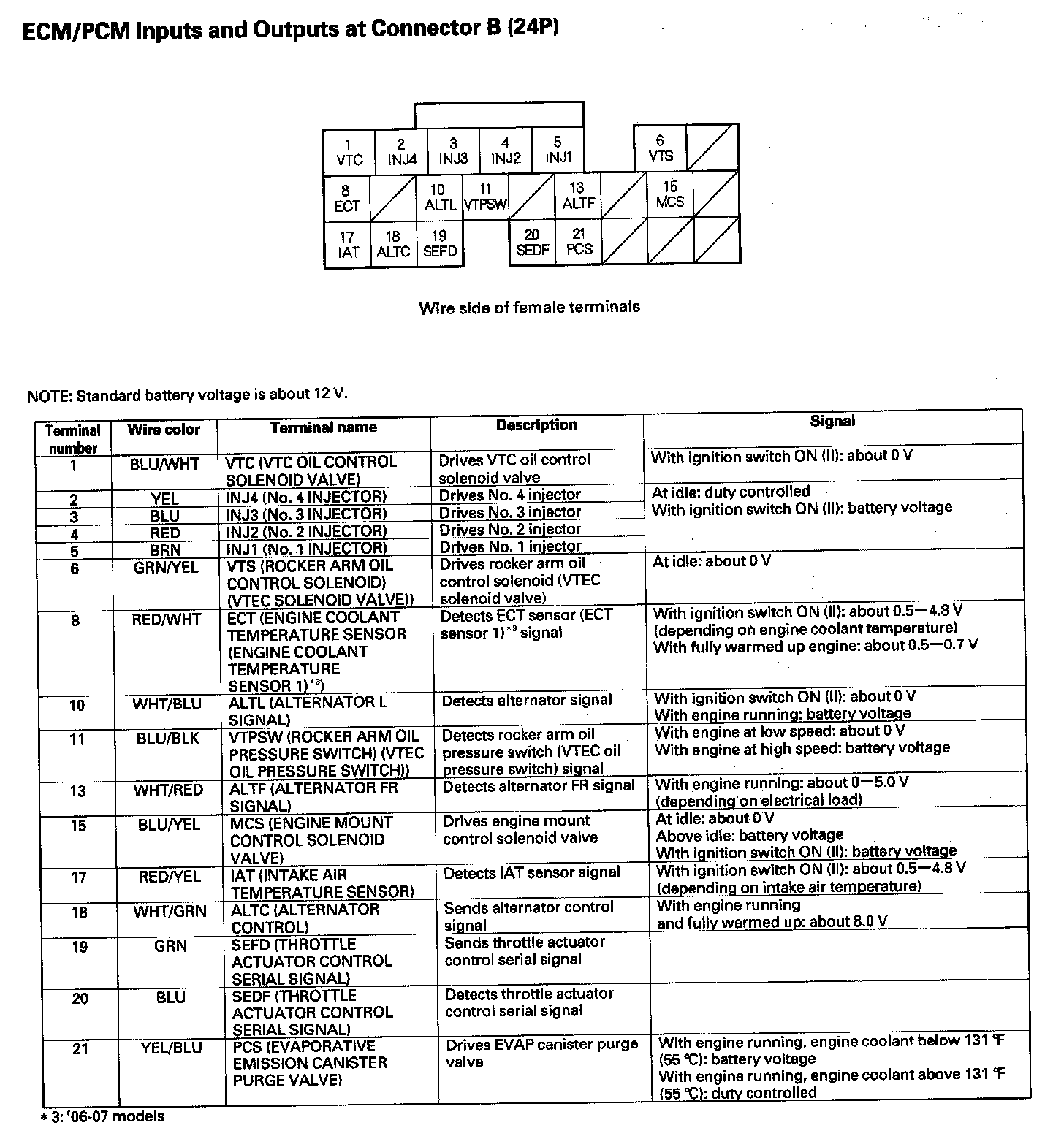 Home >> Acura >> 2007 >> TSX L4-2.4L >> Repair and Diagnosis >> Powertrain Management >> Computers and Control Systems >> Engine Control Module >> Testing and Inspection >> Pinout Values and Diagnostic Parameters
