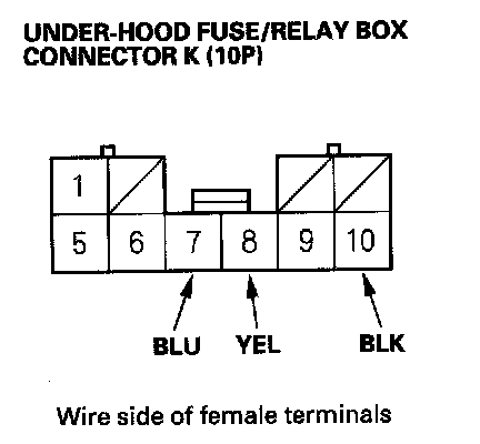 5. Disconnect the 10P connector from the under-dash fuse/relay box, and make these input tests at the connector.