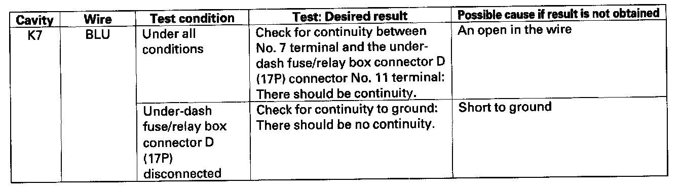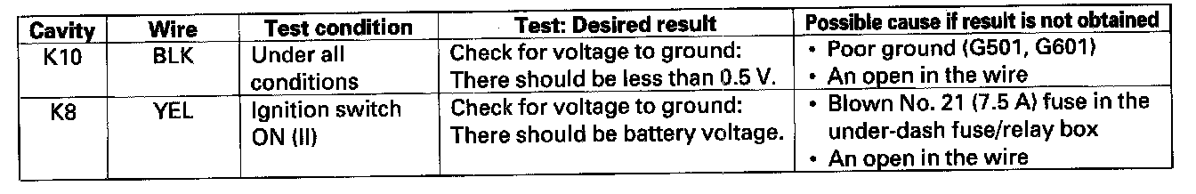 4. Reconnect the connector to the under-hood fuse/relay box, and make these input tests at the connector.