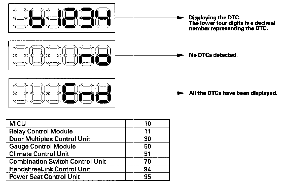 7. About 1 second after you go into self-diagnosis Mode 1, the ceiling light will indicate the DTC, and repeat it every 3 seconds. If there is more than one DTC, the system will indicate them in ascending order, beginning from the DTC with the lowest numerical value. Troubleshoot the DTCs as indicated: