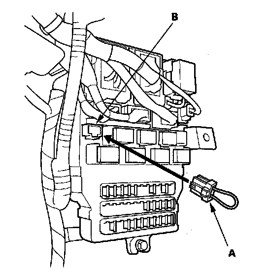 4. Connect the MPCS Service connector (A) to the MCIC socket (B) in the under-dash fuse/relay box.