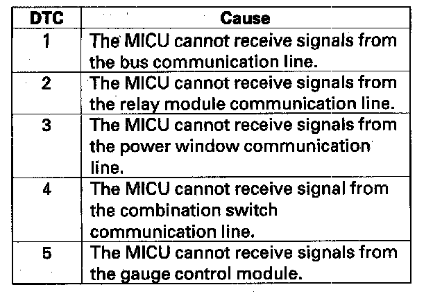1. Set the multiplex in Test Mode 1. While in Test Mode 1, the DTCs which have been detected and stored individually by various B-CAN (Body-controller Area Network) units, will be shown one by one on the ODO display when the communication between the Multiplex Integrated Control Unit (MICU) and the gauge control module is normal. To scroll through the DTCs, press the RESET knob on the gauge control module.
