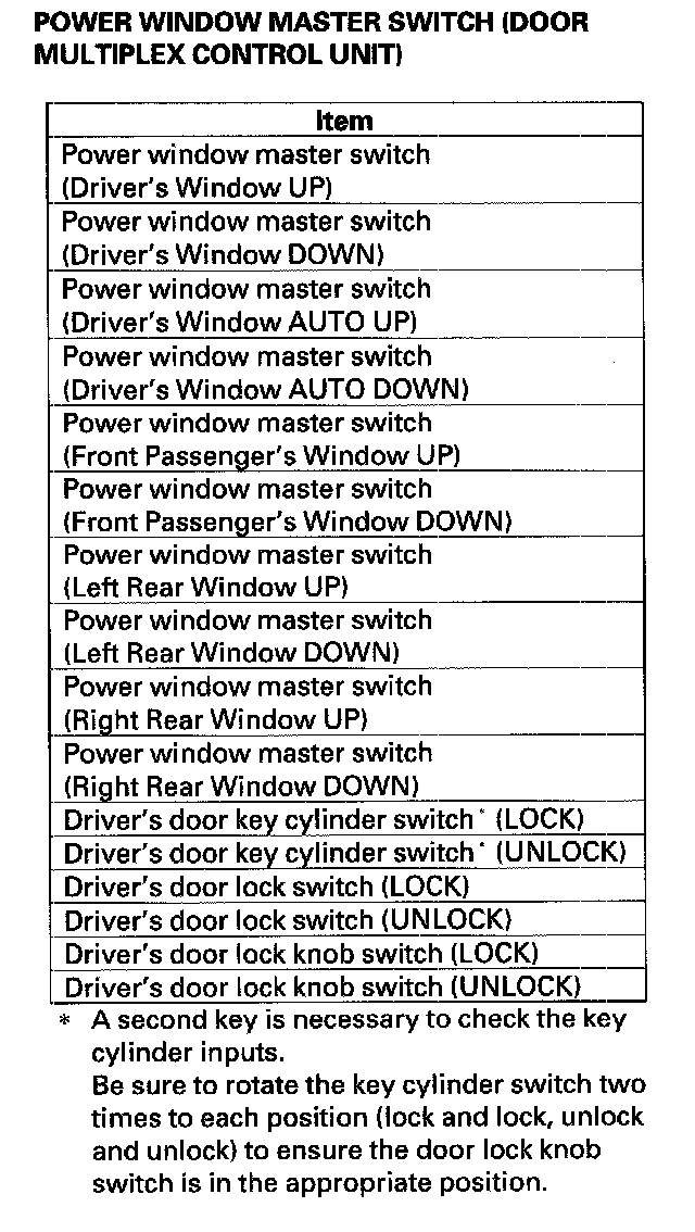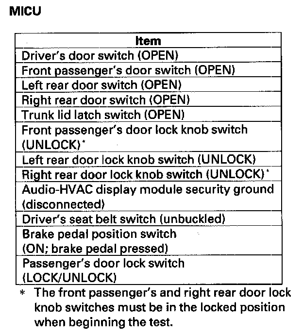 - DTC 3 only (no other DTCs present): Go to the door multiplex control unit input test. If all inputs are OK, substitute a known-good door multiplex control unit and then a MICU, one at a time, and then check for DTCs. If a DTC recurs after a substitution, replace that unit.