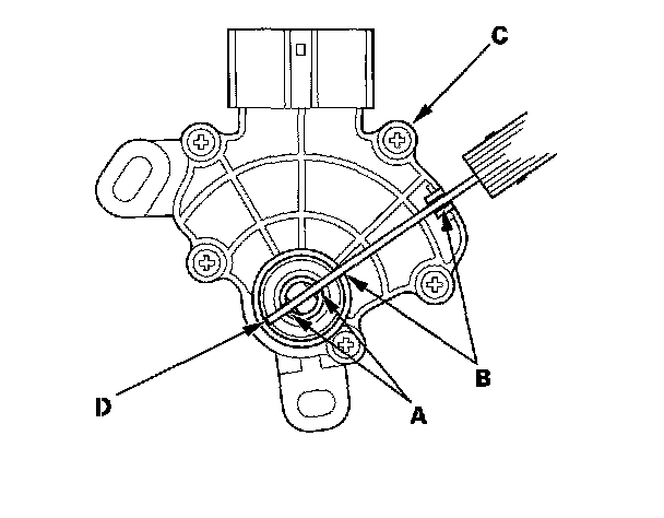7. Align the cutouts (A) on the rotary-frame with the neutral) positioning cutouts (B) on the transmission range switch (C), then put a 2.0 mm (0.08 in.) feeler gauge blade (D) in the cutouts to hold the switch in the N position.