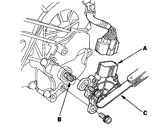 8. Install the transmission range switch (A) gently on the selector control shaft (B) while holding it in the N position with the 2.0 mm (0.08 in.) blade (C).