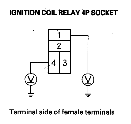3. Measure the voltage between ignition coil relay 4P socket terminal No. 1 and body ground, then terminal No. 4 and body ground.