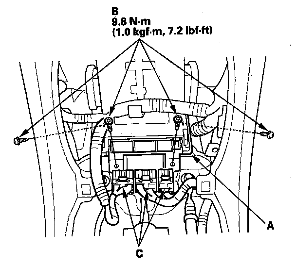 1. Install the new SRS unit (A) with TORX bolts (B), then connect the connectors (C) to the SRS unit; push them into position until they click.