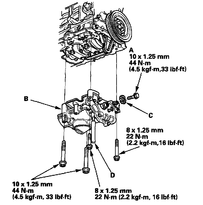 Tighten the bearing cap bolts in sequence to 29 Nm (3.0 kgf-m, 22 ft. lbs.)
