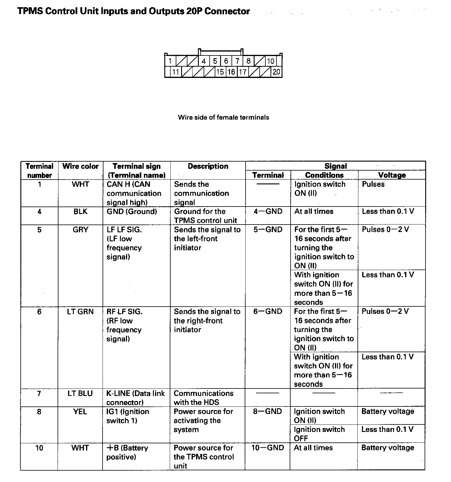 TPMS Control Unit Inputs and Outputs 20P Connector (Part 1):