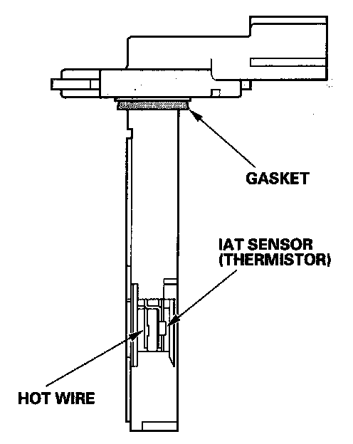 Mass Air Flow (MAF) Sensor/Intake Air Temperature (IAT) SensorThe mass air flow (MAF) sensor/intake air temperature (IAT) sensor contains a hot wire and a thermistor. It is located in the intake air passage. The resistance of the hot wire and thermistor change due to intake air temperature and air flow. The control circuit in the MAF sensor controls the current to keep the hot wire at a set temperature. The current is converted to voltage in the control circuit, then output to the PCM.