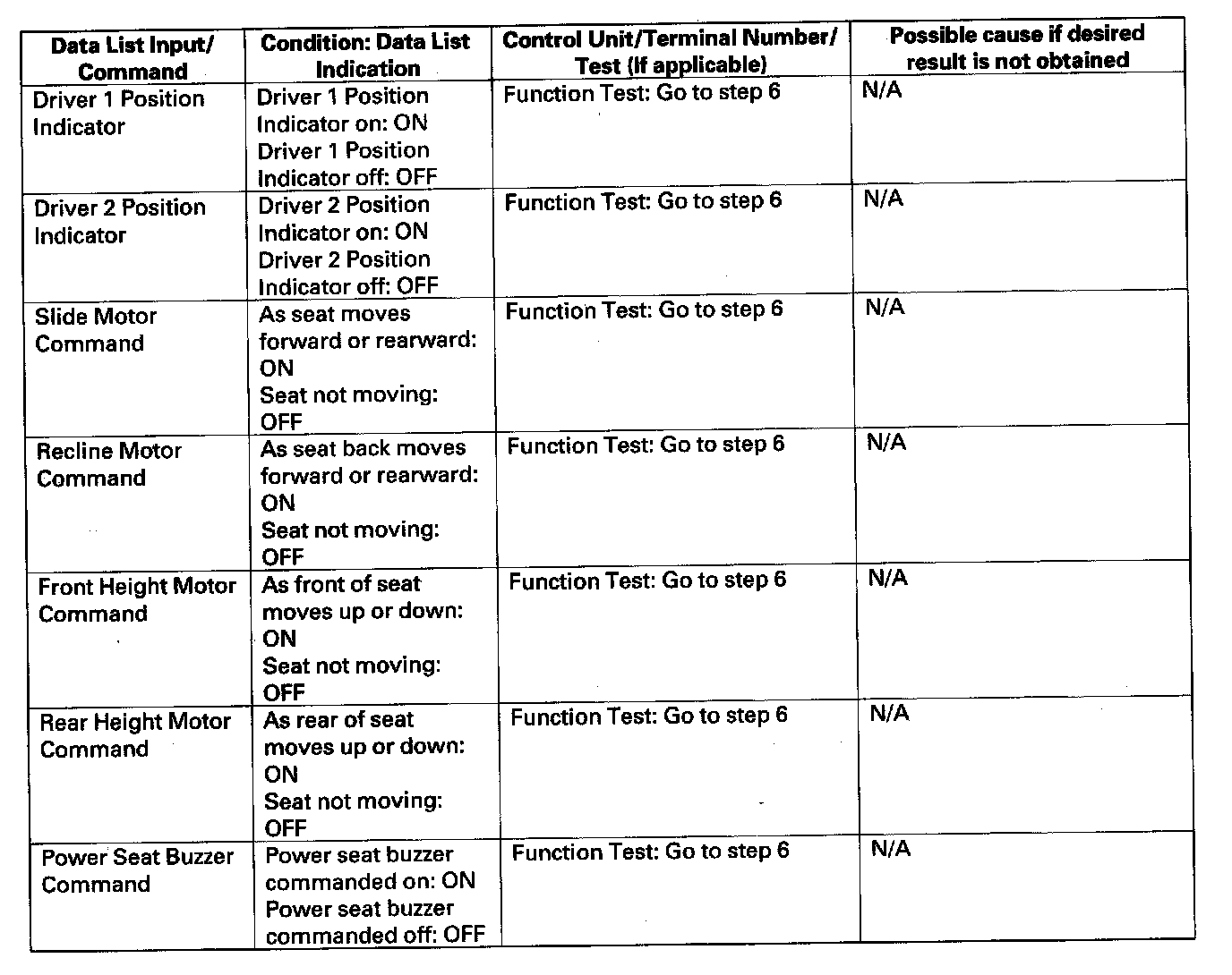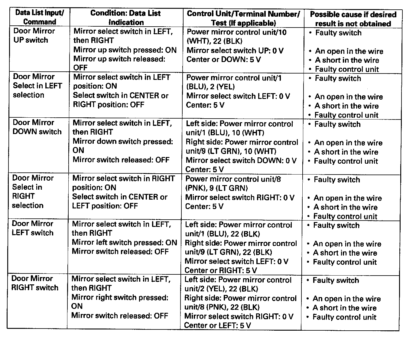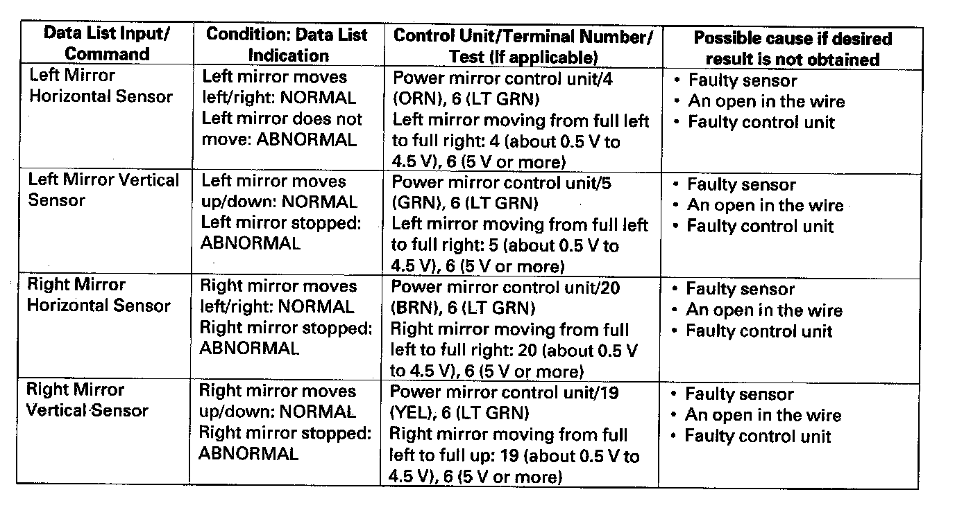 - If the function does not operate normally, perform the appropriate test at the control unit and terminal indicated in the table.