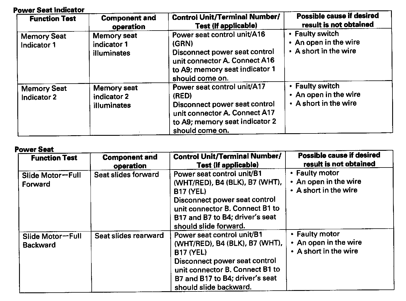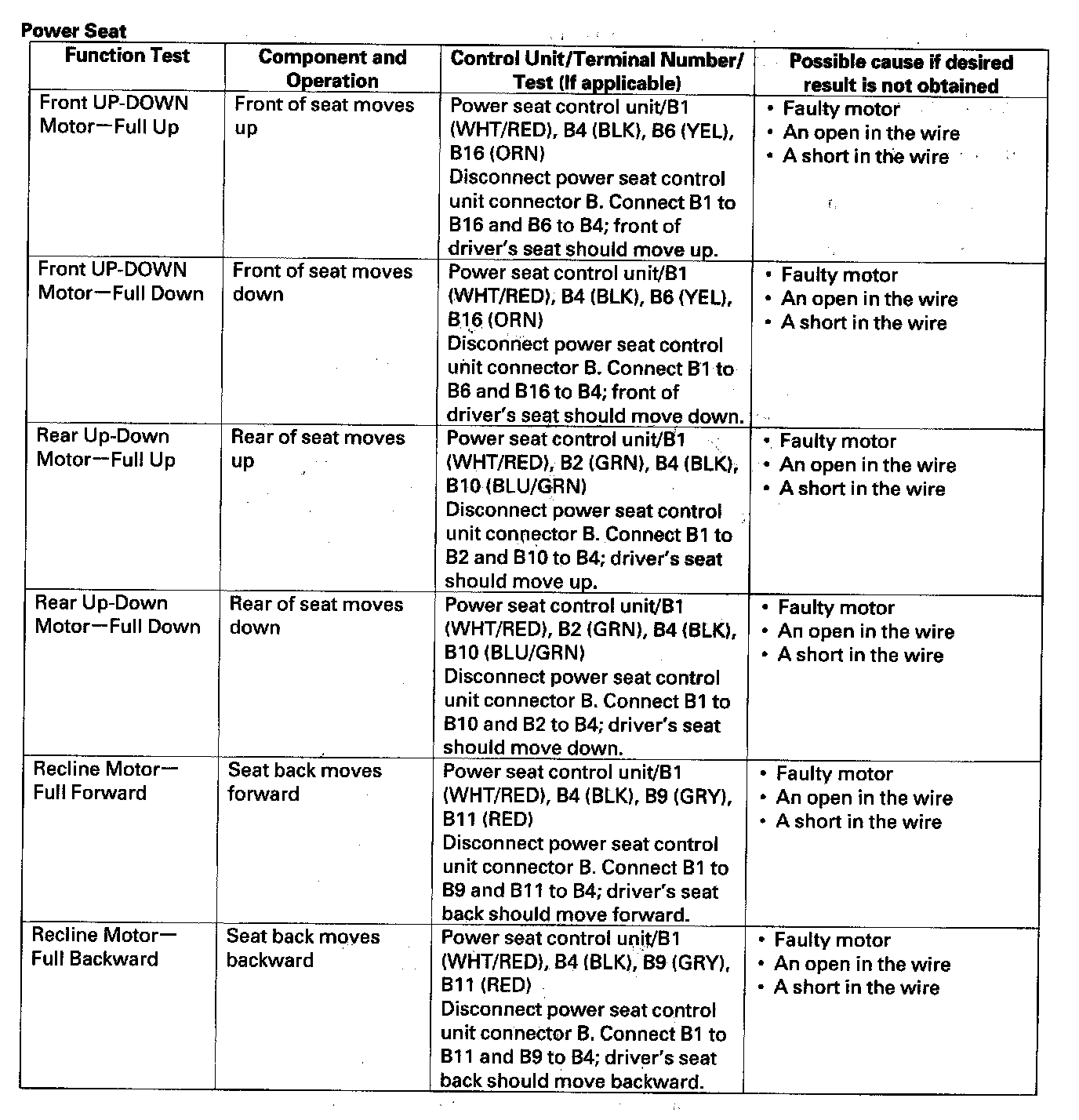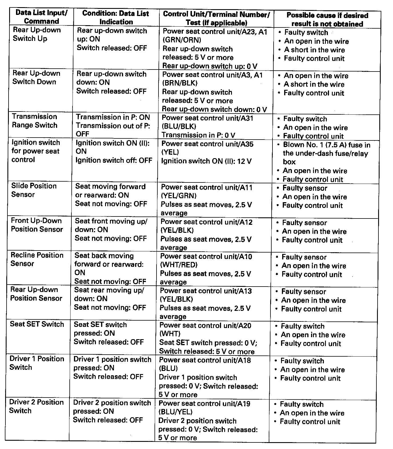 - If the function does not operate normally, perform the appropriate test at the control unit and terminal indicated in the table.