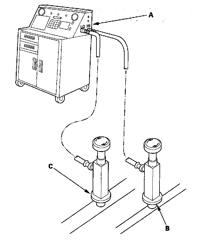 1. Connect an R-134a refrigerant recovery/recycling/charging station (A) to the high-pressure service port (B)and the low-pressure service port (C), as shown, following the equipment manufacturer's instructions.