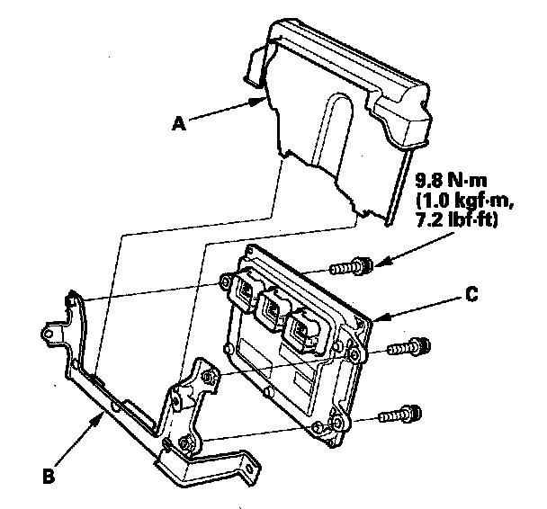 12. Remove the cover (A), and the bracket (B) from the PCM (C).