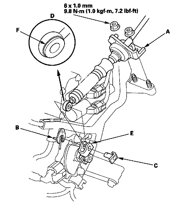 8. Check the bushing (F) in the shift cable end for proper fit and wear. If the bushing is loose or worn, replace the shift cable.