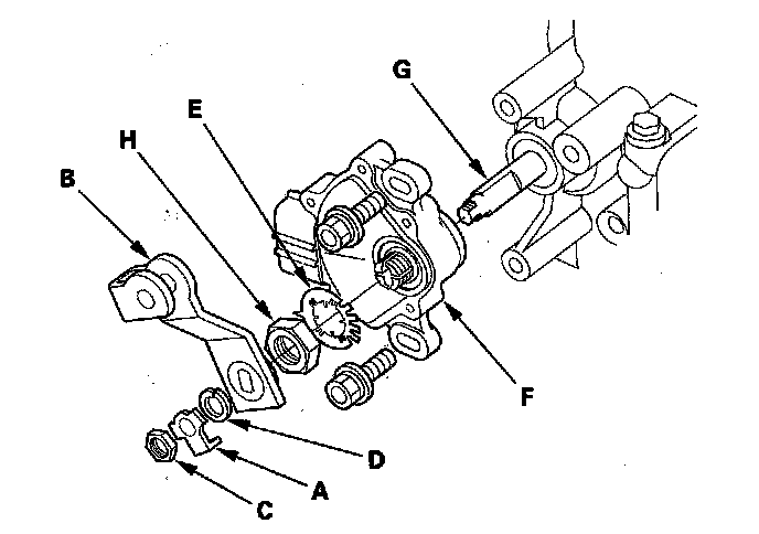11. Pry the lock tabs of the lock washer (E) on the transmission range switch (F), hold the control shaft (G) with a 6.0 mm wrench, and loosen the locknut (H).