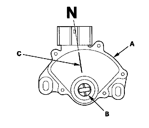 13. Set the new transmission range switch (A) to the N position. The transmission range switch clicks in the N position, and the control shaft hole (B) aligns with the N position line (C).