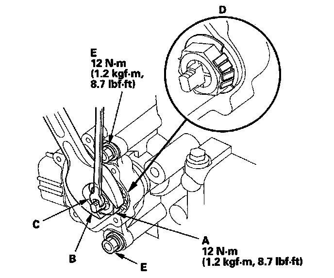 18. Tighten the bolts (E) to 12 Nm (1.2 kgf-m, 8.7 ft. lbs.) securing the transmission range switch.