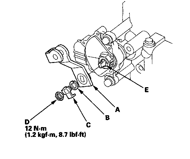 19. Install the control lever (A), spring washer (B), lock washer (C), and locknut (D) on the control shaft (E).