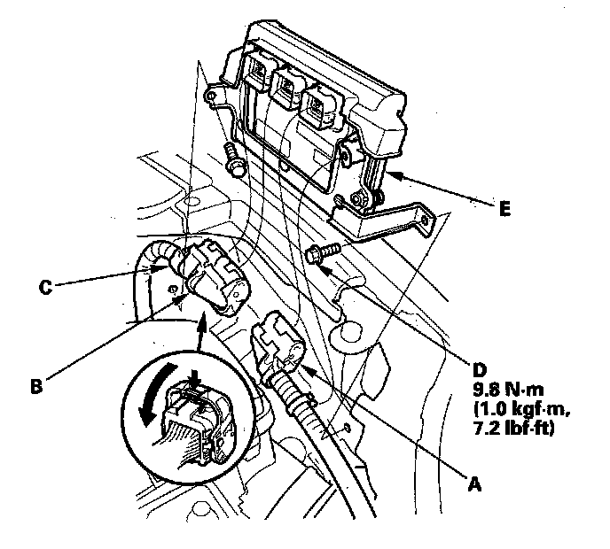 9. Remove the bolts (D), then remove the PCM assembly (E).