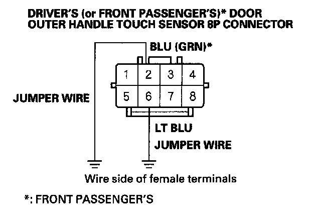 12. Connect the driver's (or front passenger's)' door outer handle touch sensor 8P connector No. 2 and No. 6 terminals to body ground with jumper wires.