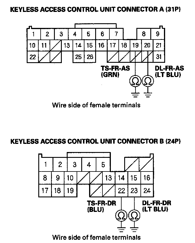 13. Check for continuity between keyless access control unit connector A (31P) terminals No. 19 and No. 20 and body ground (for front passenger's door touch sensor) or between keyless access control unit connector B (24P) terminals No. 22 and No. 23 and body ground (for driver's door touch sensor).