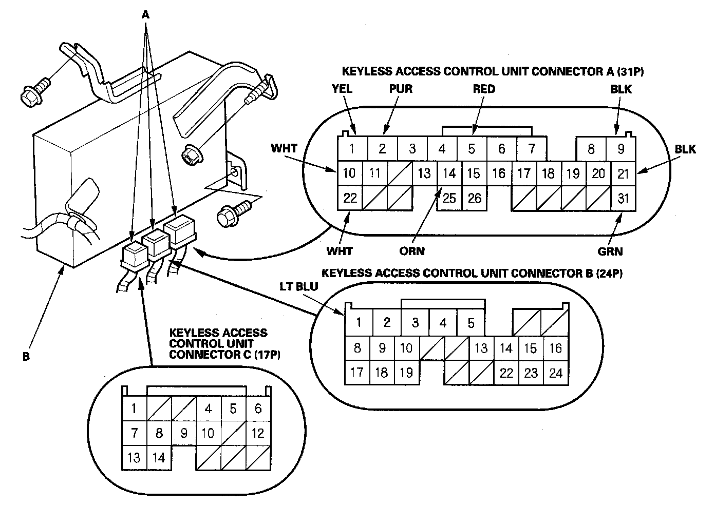 3. Disconnect the connectors (A) from the keyless access control unit (B).