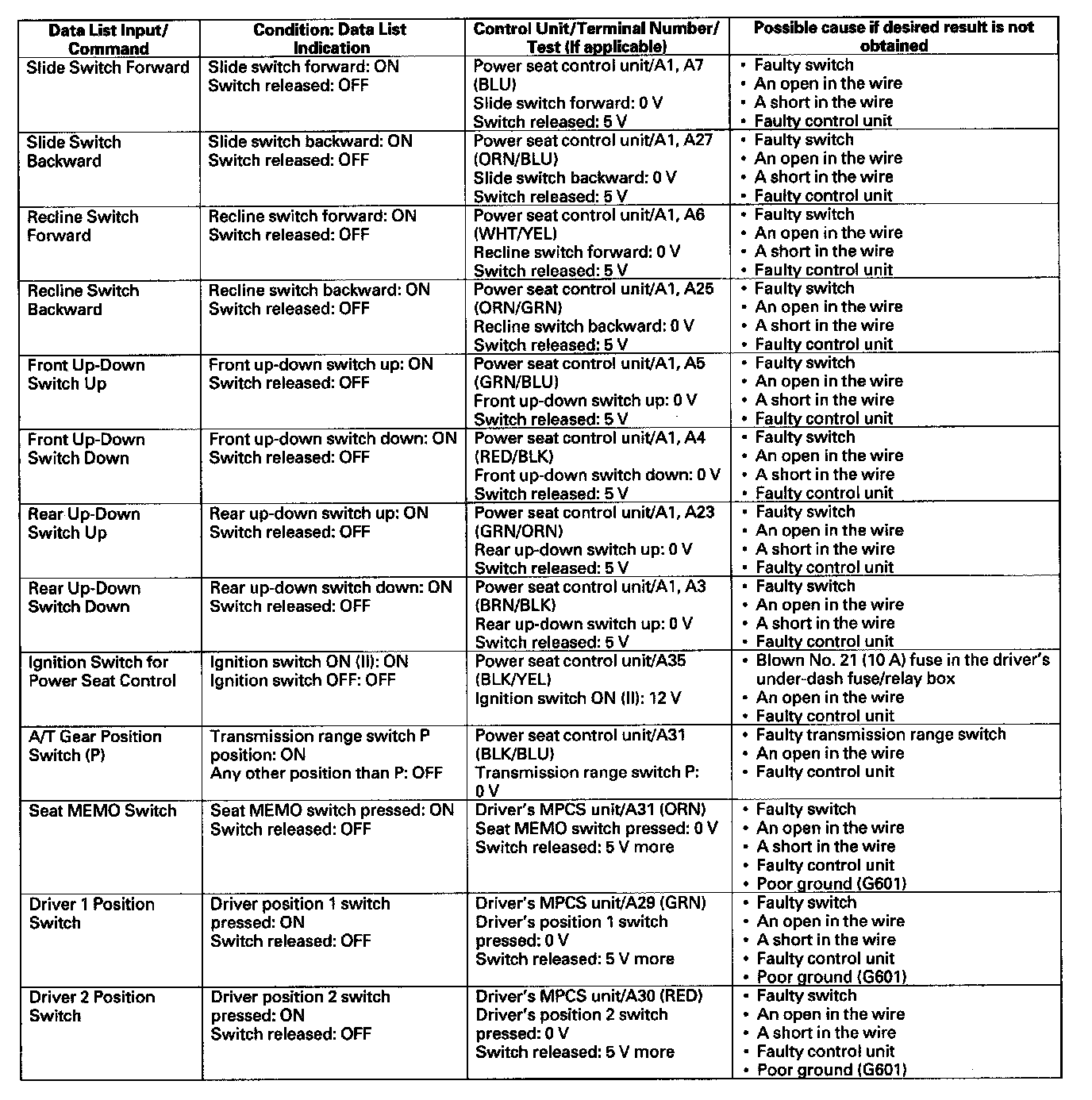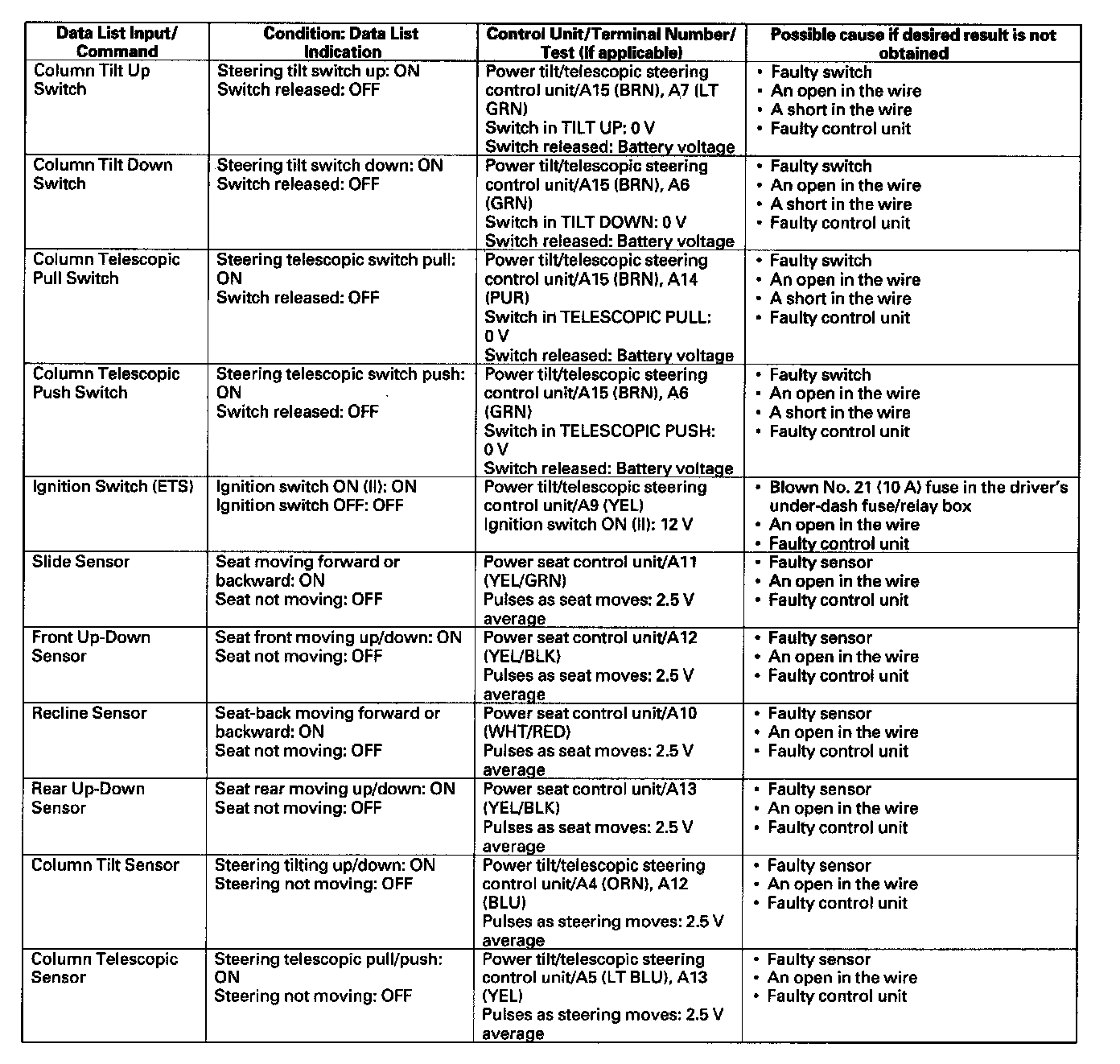 - If the data list indication is not correct, do the appropriate test at the control unit and terminal indicated in the table.
