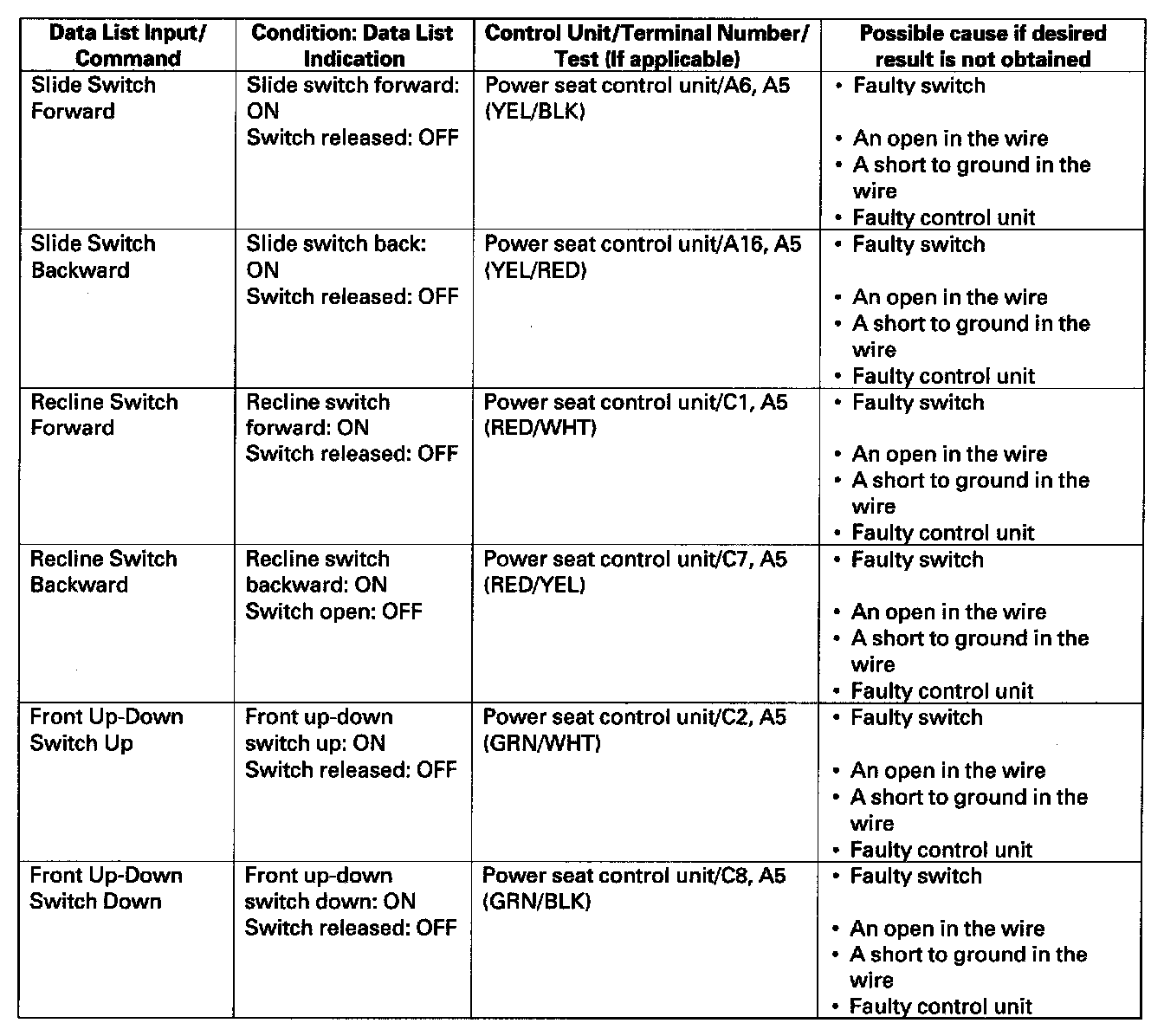 - If the function does not occur, perform the appropriate test at the control unit and terminal indicated in the table.