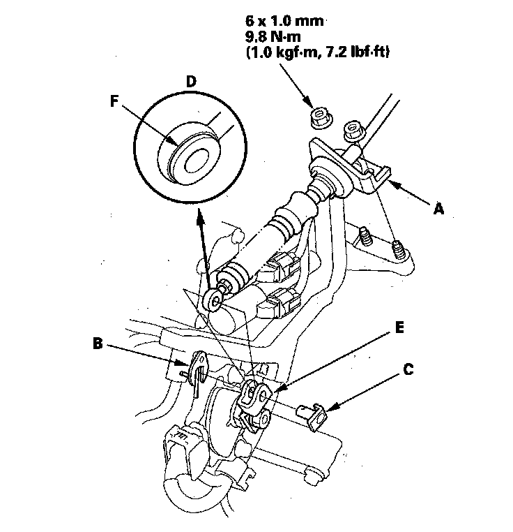9. Check the bushing (F) in the shift cable end for a proper fit and wear. If the bushing is loose or worn, replace the shift cable.