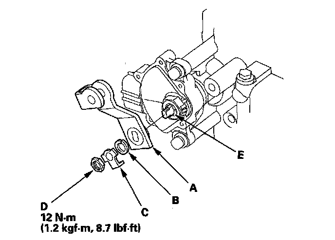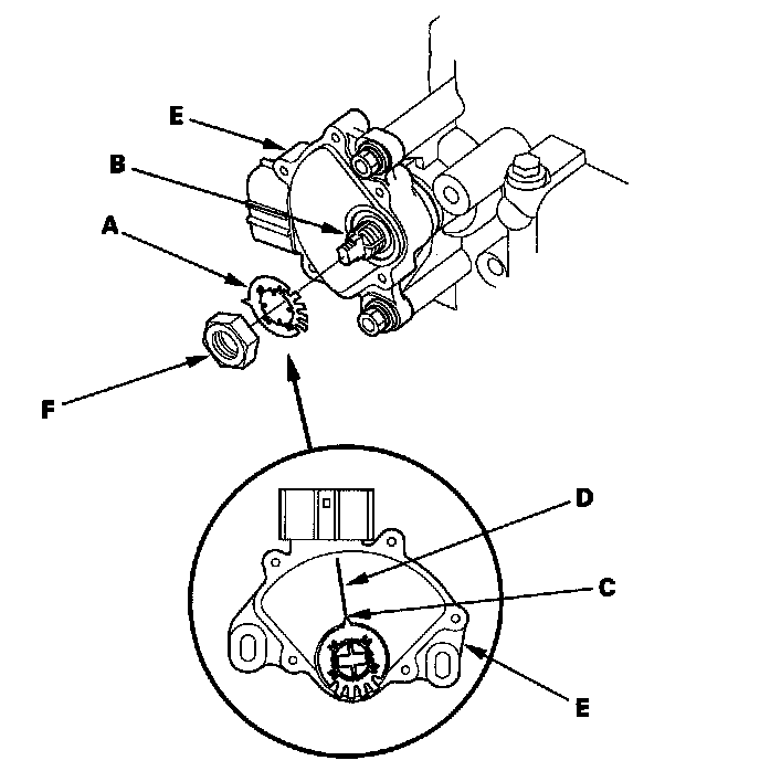 17. Install a new lock washer (A) over the control shaft (B) while aligning the projection (C) of the lock washer with the N positioning line (D) on the transmission range switch (E), and install the locknut (F).
