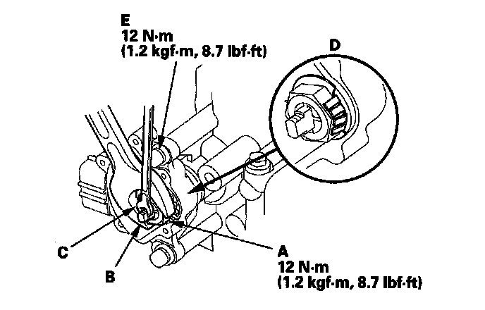 19. Tighten the bolts (E) to 12 N-m (1.2 kgf-m, 8.7 lbf-ft) securing the transmission range switch.