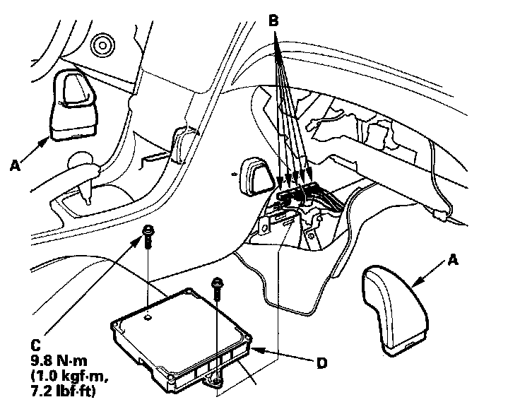 11. Remove the bolts (C), then remove the PCM (D).