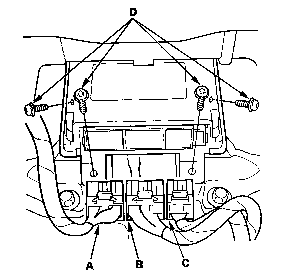 6. Disconnect SRS unit connector A (28P), SRS unit connector B (28P), SRS unit connector C (16P), and remove the TORX bolts (D), then pull out the SRS unit.