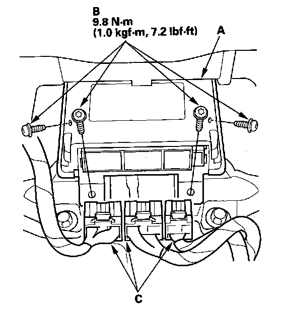 1. Install the new SRS unit (A) with TORX bolts (B), then connect the connectors (C) to the SRS unit; push them into position until they click.