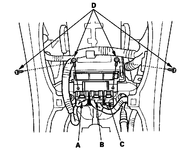 5. Disconnect SRS unit connector A (28P), SRS unit connector B (28P), SRS unit connector C (16P), and remove the TORX bolts (D), then pull out the SRS unit.